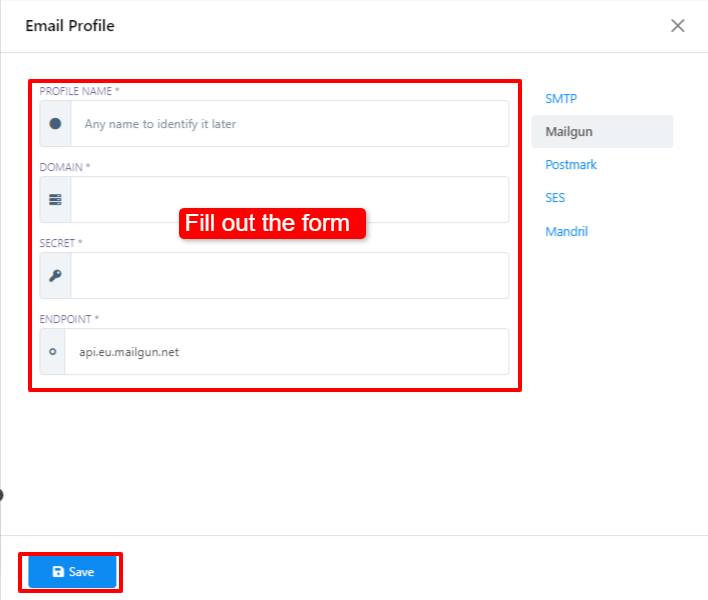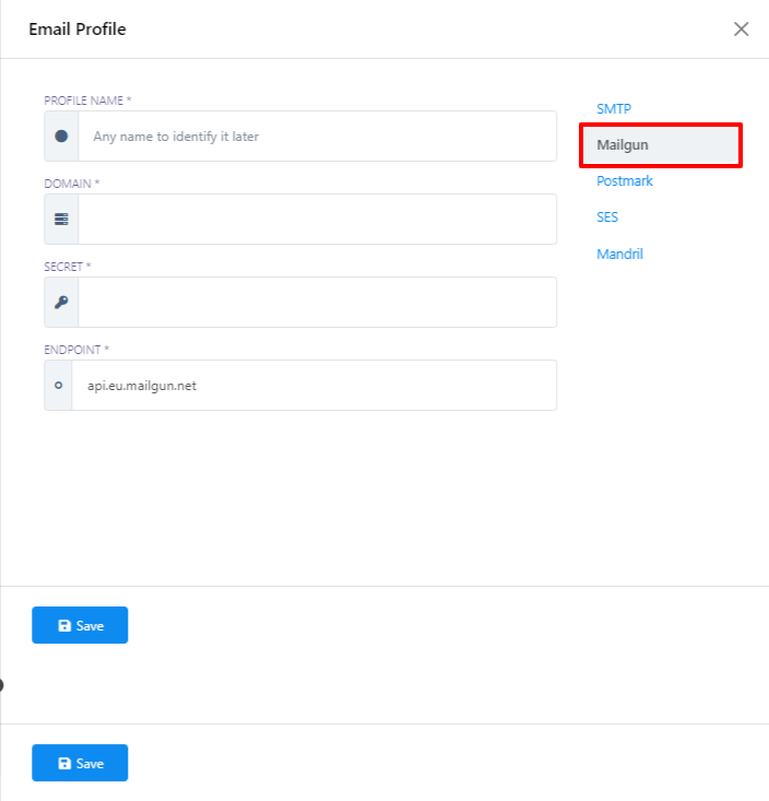 - بعد أن تقوم بملء المعلومات المطلوبة، انقر فوق الزر "حفظ" لإكمال إعداد ملف التعريف الخاص بك على Mailgun.