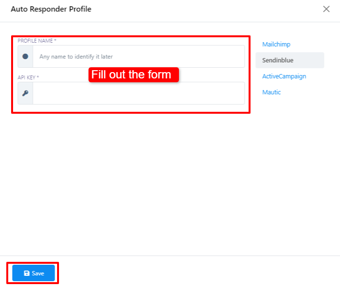 - الآن، أكمل النموذج لإنشاء ملفك الشخصي على Sendinblue. يمكنك العثور على المعلومات اللازمة لملء هذا النموذج في حسابك على Sendinblue.