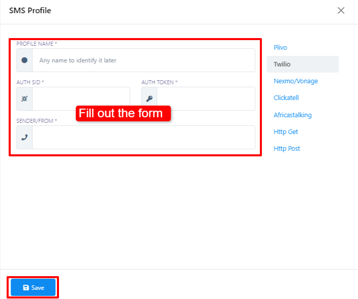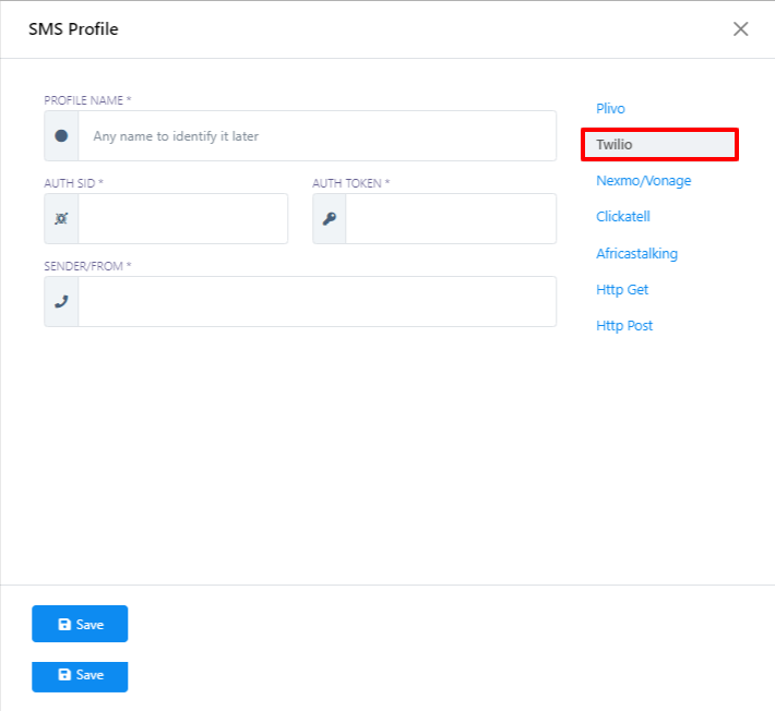 - بعد أن تقوم بملء المعلومات المطلوبة، انقر فوق الزر "حفظ" لإكمال إعداد ملف التعريف الخاص بك على Twilio.