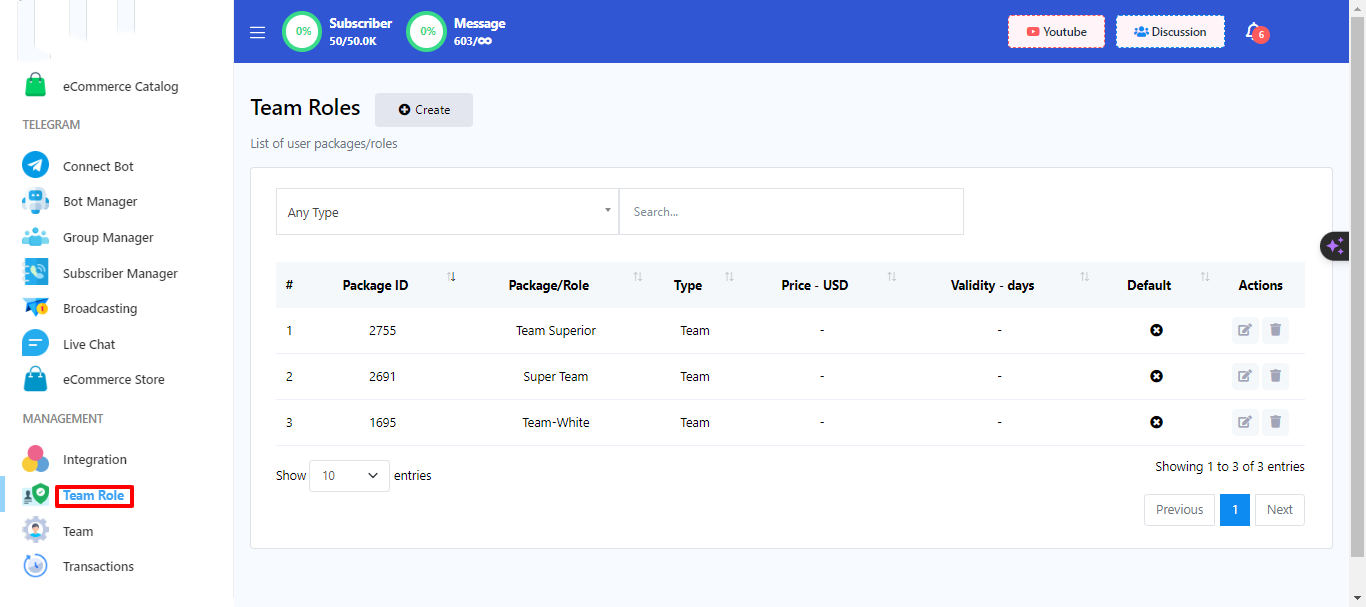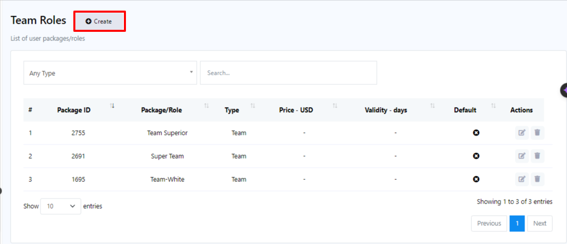 3. ضمن قائمة دور الفريق، انقر فوق الزر "إنشاء".