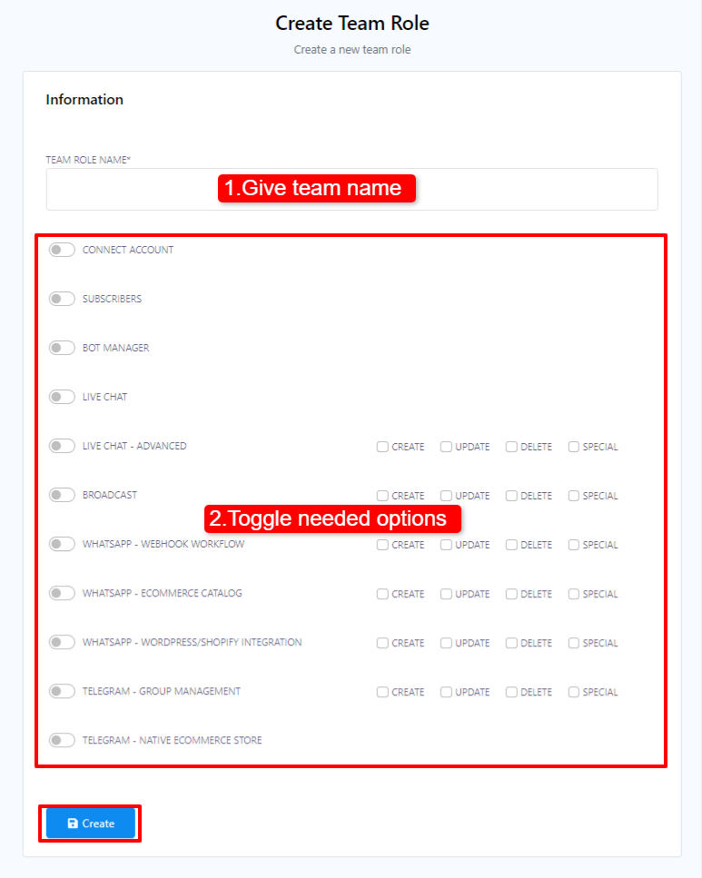 في منصة روبوت الدردشة لدينا، يُحدد دور الفريق المهام المُسندة لكل فريق مُشارك في إدارة مهام مُختلفة. يُمكن أن يتكون الفريق من عدة أعضاء. عملية إضافة أعضاء الفريق مُوضحة في قسم "الفريق" على منصتنا. لتعيين المهام لأعضاء الفريق، عليك أولاً إنشاء دور الفريق، ثم تحديد صلاحيات المهام التي تُريد أن يُديرها أعضاء الفريق.