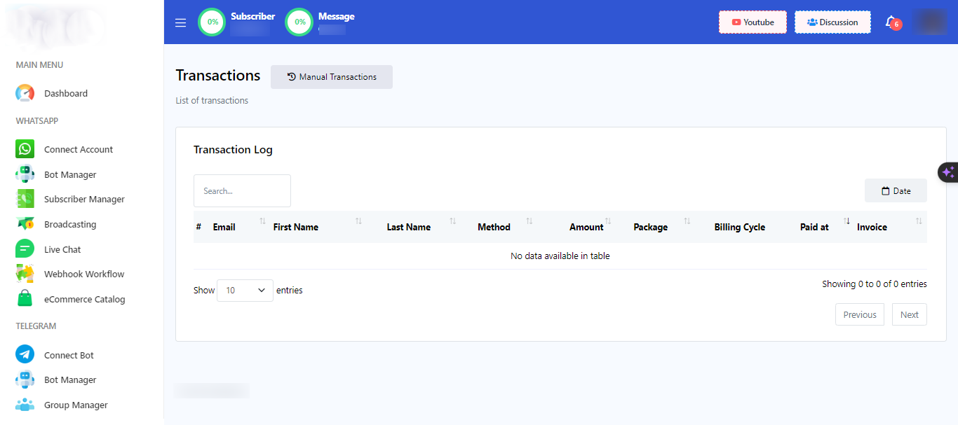 في منصة روبوت المحادثة لدينا، نوفر قسمًا مخصصًا "للمعاملات" يُمكّن المستخدمين من إدارة معاملاتهم السابقة والمعلقة بكفاءة. صُممت هذه الميزة الشاملة لتلبية احتياجات المعاملات التي تتم عبر روبوت المحادثة لدينا، بالإضافة إلى المعاملات الصادرة من قنوات مختلفة، مثل موقعنا الإلكتروني وتطبيقنا للهواتف المحمولة.