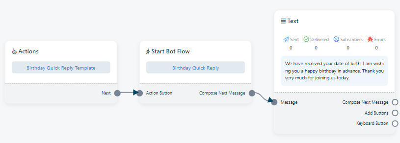 رد عيد الميلاد: "رد عيد الميلاد" هو نموذج رسالة مُعدّ مسبقًا، يُستخدم عند استلام بوت لتاريخ ميلاد المستخدم. يمكن للمستخدمين ضبط رد عيد الميلاد هذا لاستخدامه مع أي بوت.
