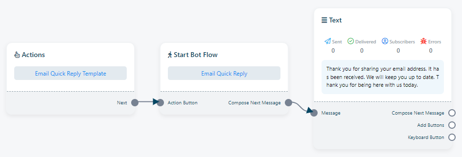 رد البريد الإلكتروني: وبالمثل، "رد البريد الإلكتروني" هو قالب رسالة مُعدّ مسبقًا، متاح للاستخدام عندما يستلم بوت بريدًا إلكترونيًا من مستخدم. يمكن للمستخدمين تخصيص هذا الرد لأي بوت حسب الحاجة.