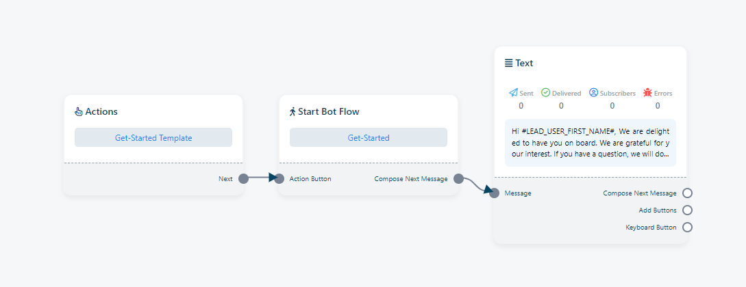 البدء: صُممت ميزة "البدء" لبدء تدفق بوت دون الحاجة إلى كلمات مفتاحية محددة. يوجد زر "بدء" في تيليجرام، وبالنقر عليه يتم تشغيل بوت البدء. يتمتع المستخدمون بمرونة تخصيص بوت البدء هذا.