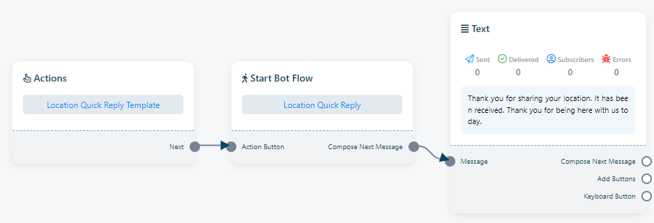 رد الموقع: "رد الموقع" هو قالب رسائل مُعدّ مسبقًا، مُصمّم للحالات التي يستلم فيها بوت موقعًا أو عنوانًا من مستخدم. يُمكن للمستخدمين تطبيق رد الموقع هذا على أي بوت ضمن نظامهم.