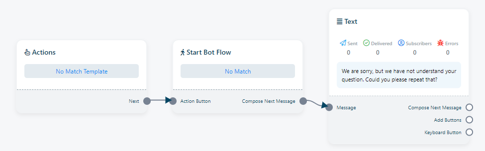 انقر على "لا يوجد تطابق" لتخصيصه. يمكن إضافة عناصر متنوعة، مثل الصور والصوت والفيديو والملفات، أو أي شيء آخر مطلوب، إلى رد البوت هذا. إنه مجرد رد بوت آخر عندما لا توجد كلمات رئيسية مطابقة.