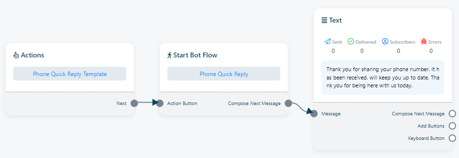 الرد الهاتفي: "الرد الهاتفي" هو قالب رسائل مُصمم مسبقًا، يُمكن نشره عند استلام الروبوت لرقم هاتف من مشترك. لديك مرونة استخدام هذا "الرد الهاتفي" مع أي روبوت. زر "الرد الهاتفي" قابل للتعديل أيضًا.