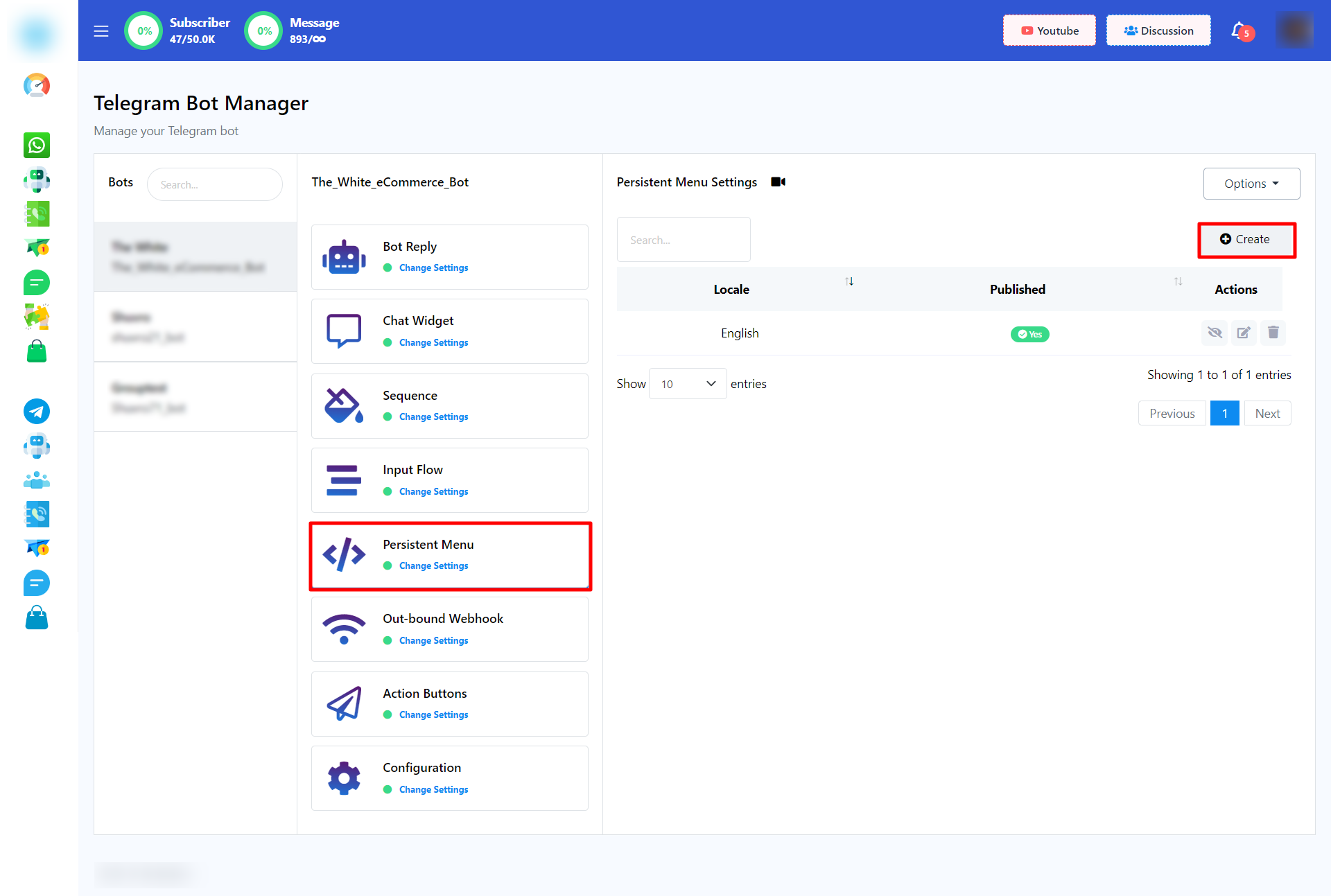 - انتقل إلى Telegram Bot Manager وقم بالوصول إلى قسم "القائمة الدائمة" من الشريط الجانبي الأيسر.