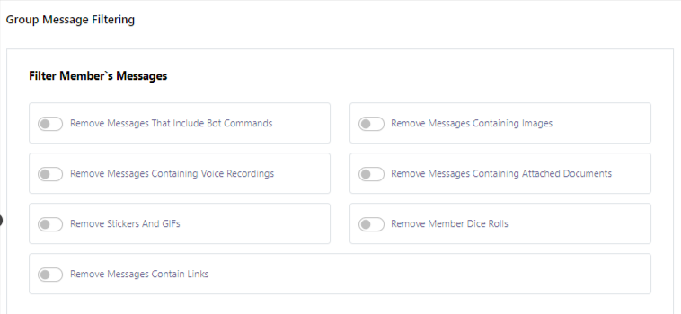 - إزالة رميات النرد الخاصة بالأعضاء: قم بتصفية وإزالة الرسائل التي تحتوي على رميات النرد من أعضاء المجموعة، مما يقلل من البريد العشوائي والمحتوى غير المرغوب فيه.