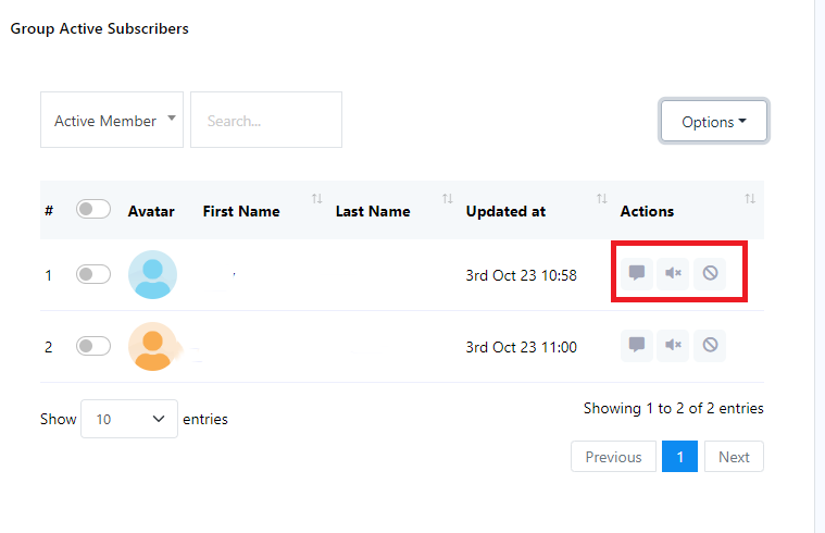 بعد ذلك، ستجد قائمة بأعضاء مجموعتك. يمكنك تخصيص عدد الأعضاء المعروضين باستخدام خيار "إظهار الإدخالات"، والتنقل عبر القائمة باستخدام زري الصفحة السابقة والتالي.