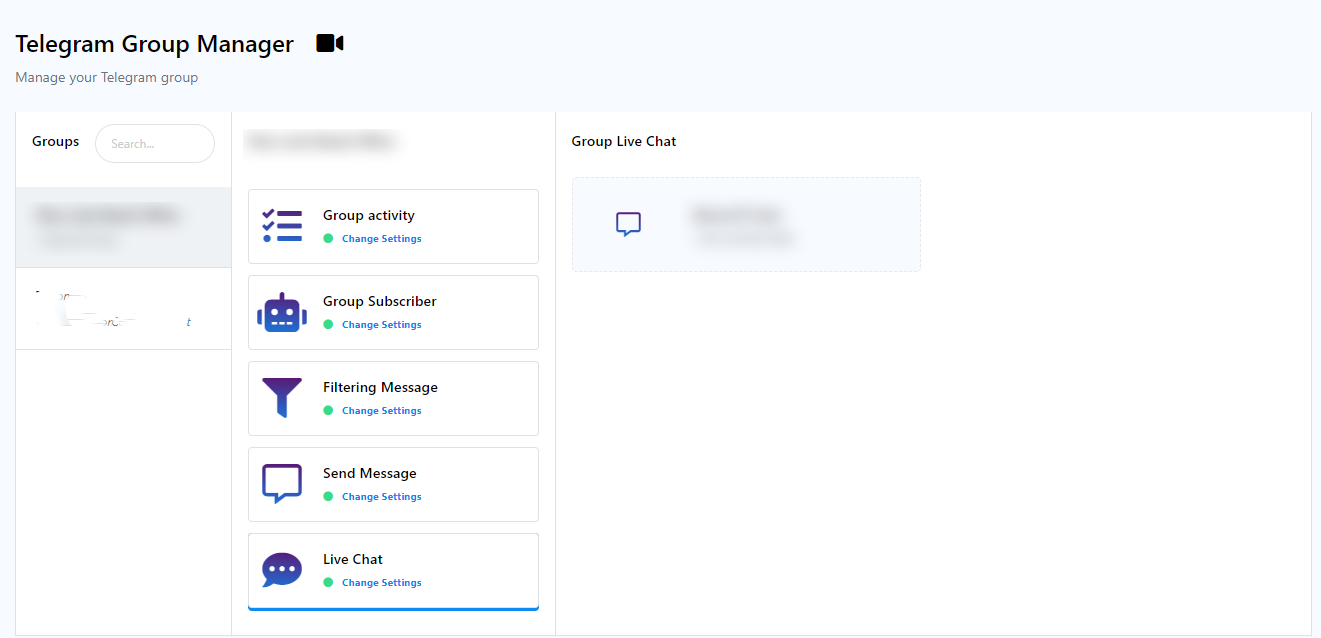 للاستفادة من ميزة الدردشة المباشرة، يجب عليك إنشاء حساب وربطه بمجموعة تيليجرام الخاصة بك. بعد ذلك، يمكنك الوصول إلى ميزة الدردشة المباشرة بالانتقال إلى تبويب "الدردشة المباشرة" في لوحة التحكم.
