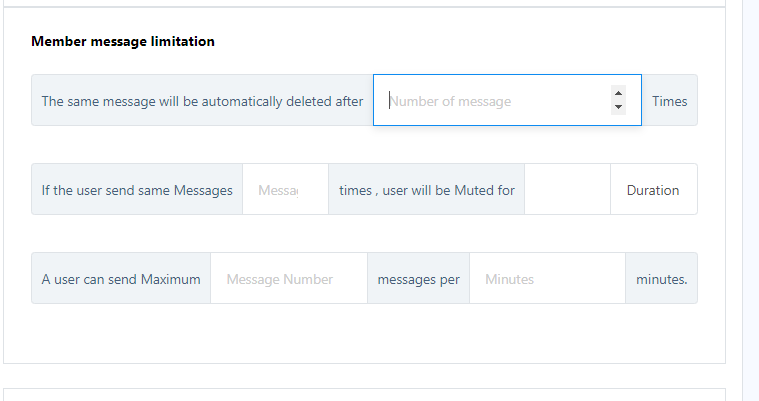 تقييد رسائل الأعضاء: تتيح لك هذه الميزة ضبط الحذف التلقائي للرسائل المتكررة بعد عدد محدد من مرات الاستخدام. بالإضافة إلى ذلك، يمكنك إعداد خاصية كتم الصوت تلقائيًا للمستخدمين الذين يُكررون إرسال نفس الرسالة، مع إمكانية تحديد مدة هذا الكتم.