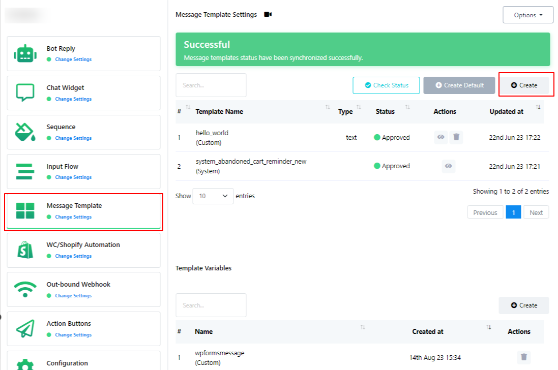 يمكنك استخدام متغيرات القالب من قسم "متغير القالب". إذا كنت ترغب في إنشاء متغير جديد، يمكنك ذلك بالنقر على زر "إنشاء" ضمن قسم "متغير القالب".