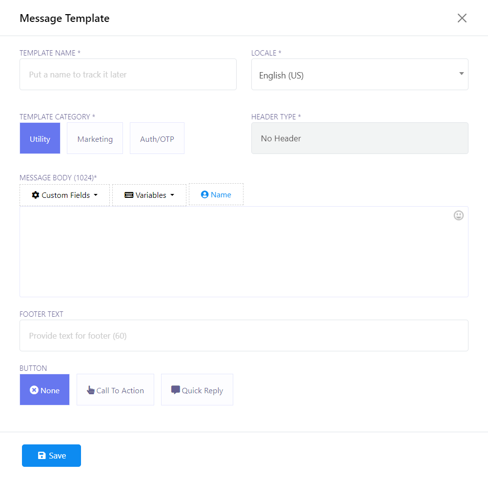 Optionally, you can add a button for your template. There are two types to choose from: `Call To Action` and `Quick Reply`. For these buttons, a reply will be needed when using them for practical purpose.