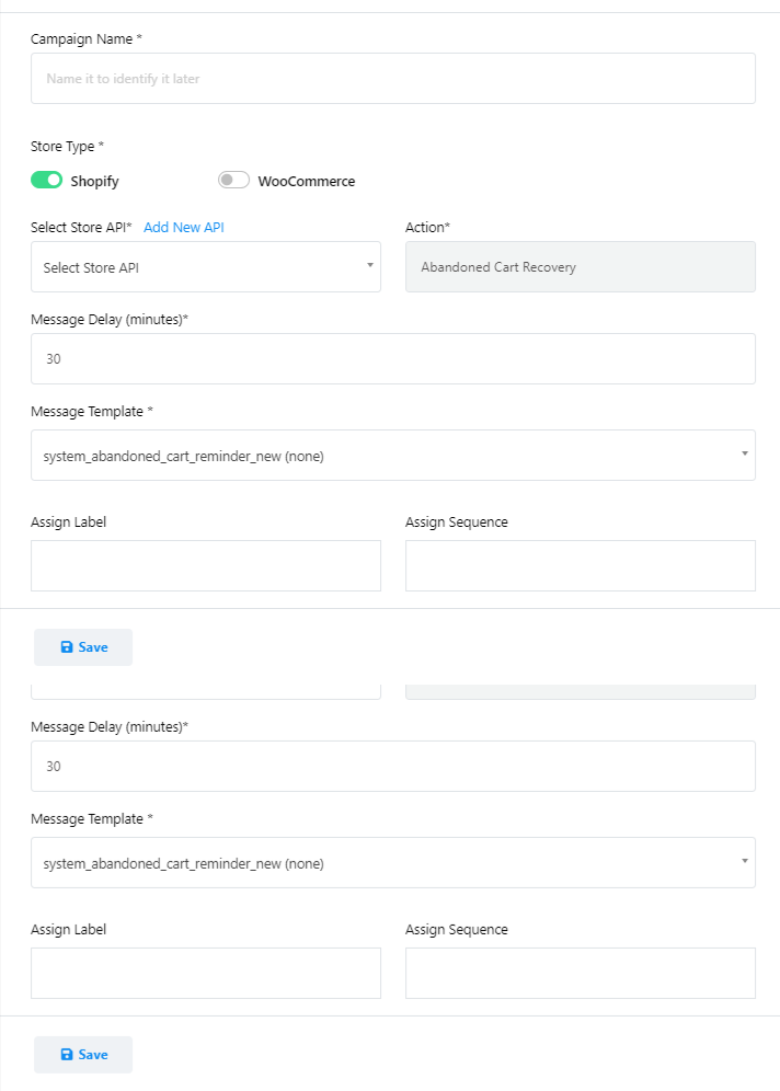 ملاحظة: إذا لم تقم بدمج Shopify أو Woo-Commerce، فيمكنك دمجهما من إضافة `واجهة برمجة تطبيقات جديدة`.