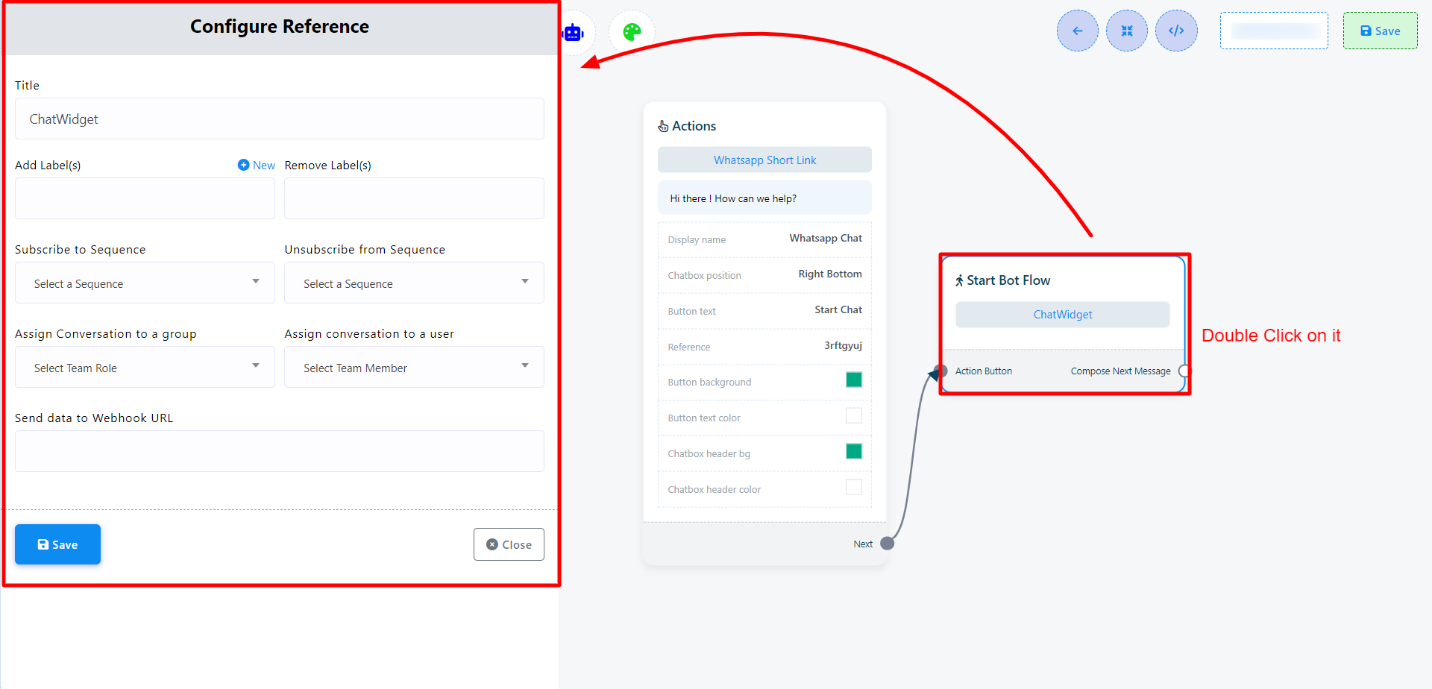 - في الإجراءات، يتم تحديد رابط WhatsApp المختصر افتراضيًا