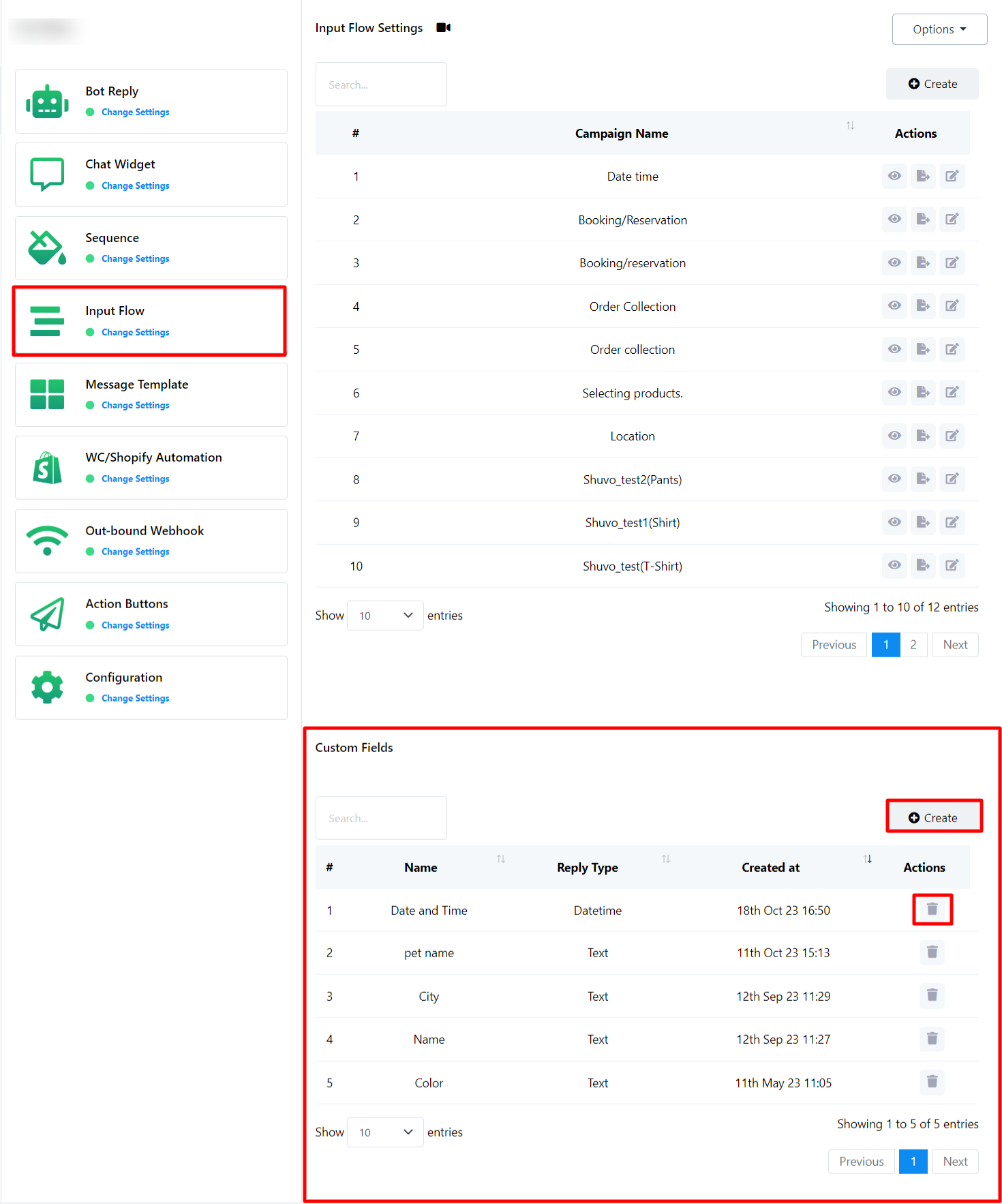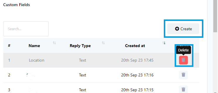 - انقر فوق "إنشاء" في قسم الحقول المخصصة لإنشاء حقل مخصص جديد لاستخدامه في تدفقات إدخال المستخدم.
