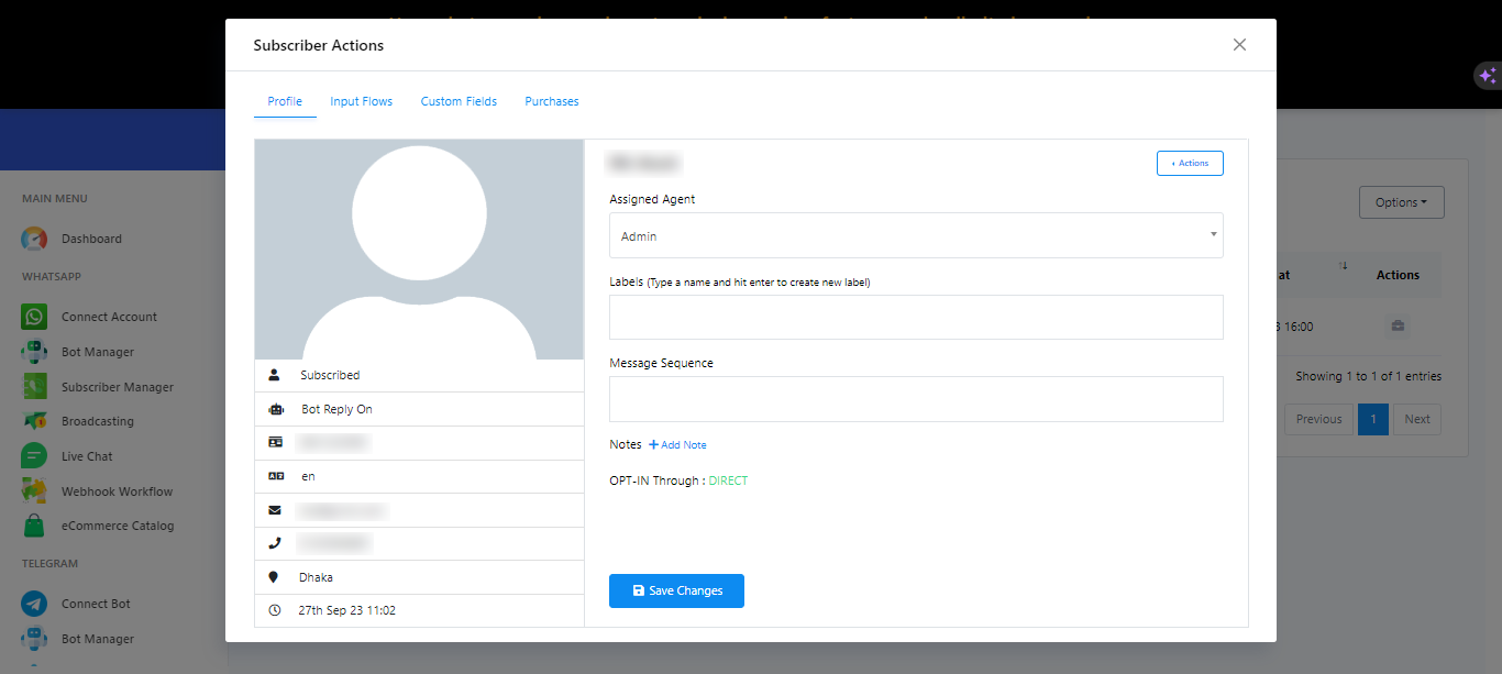 - انقر فوق "إجراء" لإلغاء اشتراك المشترك، أو إيقاف الرد الآلي مؤقتًا أو استئنافه، أو إعادة تعيين تدفق إدخال المستخدم، أو مزامنة بيانات المشترك.