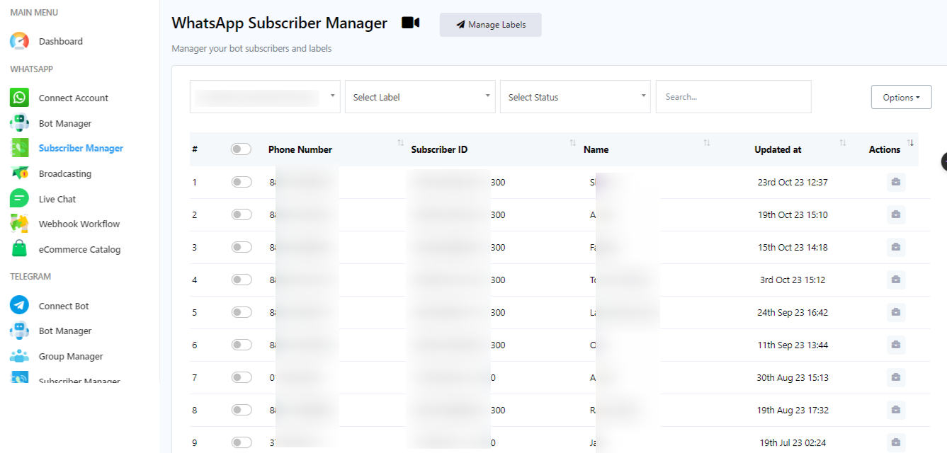 صُمم مدير مشتركي واتساب لإدارة جهات اتصال ومشتركي واتساب وتنظيمها بكفاءة. يُمكّن المستخدمين من تبسيط حملات المراسلة والتواصل مع مجموعة كبيرة من المشتركين، مما يجعله مثاليًا للشركات والمسوقين والمؤسسات. باستخدام هذه الأداة، يمكنك تصنيف جهات اتصالك وإدارتها، مما يساعدك على إرسال رسائل مخصصة، وجدولة البث، وتحليل أداء الحملات، مما يُساعدك في النهاية على البقاء على تواصل وتفاعل فعال مع جمهورك على واتساب.